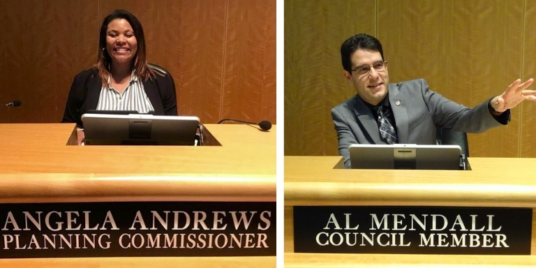 Side by side photos of Councilmember Angela Andrews and Councilmember Al Mendall at the City Council podium