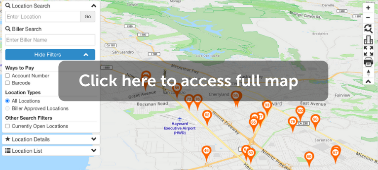 Hayward Water System customers can pay their bills with cash at various participating retail locations, inluding select 7 Eleven, CVS, and Walgreens locations, among others. Search by zip code, biller name, and select "All Locations" in the map below to find payment locations near you.