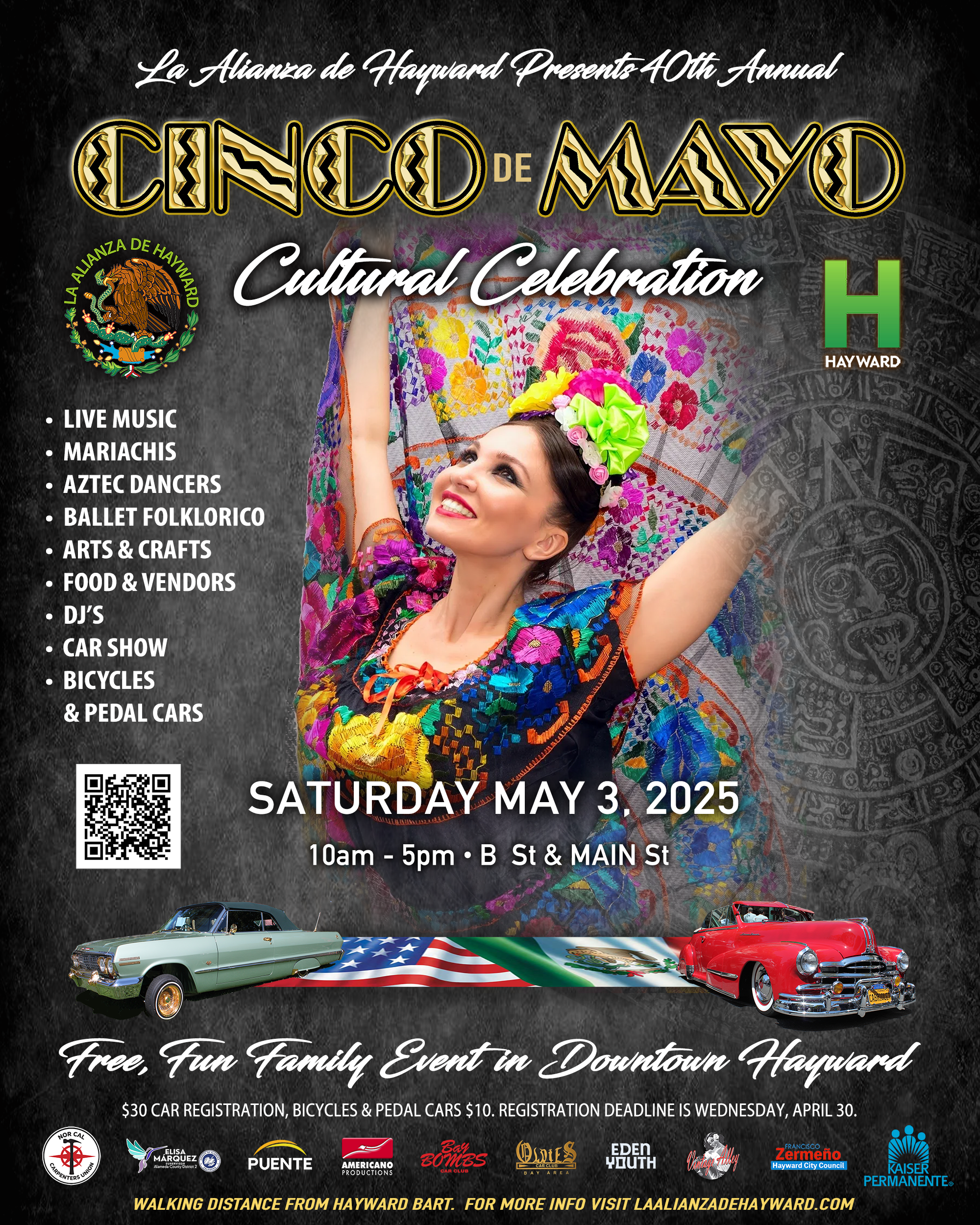 This free, family-friendly event is hosted by La Alianza de Hayward and made possible with the support of the City of Hayward, Hayward Chamber of Commerce, and an array of other businesses, community organizations and community leaders.