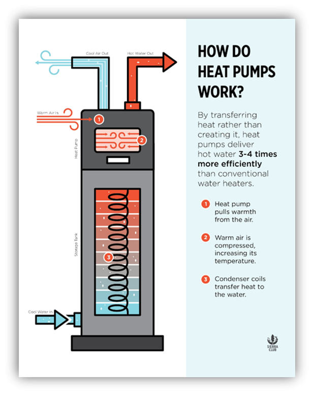 Heat pump water heaters (HPWH) are all-electric, high-efficiency water heaters that, unlike gas-powered water heaters and electric resistance water heaters, heat water by transferring heat from the surrounding air rather than creating new heat. Heat pumps work like your kitchen refrigerator, but in reverse. Transferring heat rather than creating it allows HPWHs to be up to four times more efficient than gas and electric resistance water heaters, conserving power and reducing your energy bill.