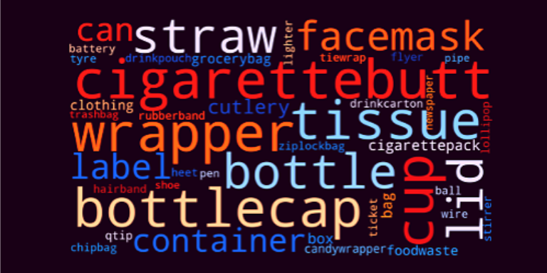 Pictured above is a word-cloud showing the diversity of litter observed during the study, with the